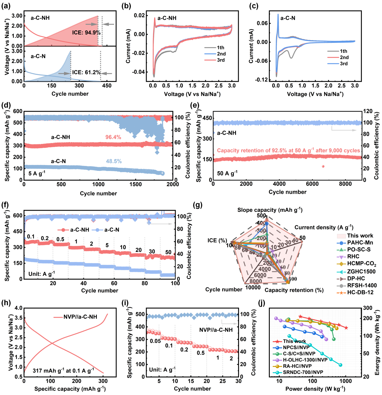 基于此,研究团队通过氨基氮引导孔道构建,利用气相辅助热解方法,在分子层面实现硬碳材料中氮构型的重组及多级孔道的建立。利用NH3在热解过程中的解离特性,使其产生的氨基官能团与碳骨架中的不饱和位点发生选择性反应,将电化学不可逆的吡咯氮转化为高度可逆的吡啶氮构型,诱导形成了垂直排列的贯通孔道结构,进而缓解了“层间限域”效应。同时,引入的氨基官能团能够在电池负极-电解质界面引导形成具有梯度化学组成的超薄SEI膜,而且氟化物富集在其亚表面,可显著提升界面离子的传输效率,大幅减少了钠的不可逆损耗。得益于多级孔道结构与界面协同效应,所制备的硬碳负极的综合性能在斜坡型硬碳材料中表现突出:首次库伦效率高达94.9%,可逆容量达到400.3 mAh g-1,在50 A g-1的极端电流密度下仍保持208.2 mAh g-1的优异容量,并展现出长达9000次循环的卓越稳定性。