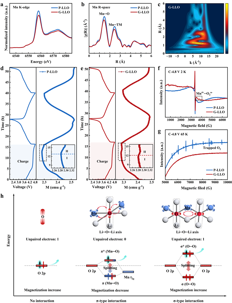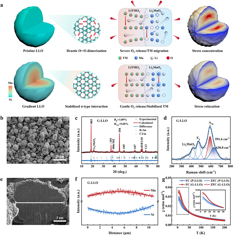 针对上述难题,研究团队采用全浓度梯度设计方案,成功合成了一种从颗粒中心到表面锰含量逐渐降低、镍含量逐渐升高的富锂锰基材料。该梯度结构能有效缓解充放电过程中因锂离子不均匀脱嵌引发的内部应力积累,显著增强了材料的结构稳定性。电化学测试结果表明,该材料在1C倍率下放电容量可达216 mAh g-1,在2C倍率下循环200圈后容量保持率高达91.8%,呈现出优异的循环稳定性与倍率性能。为揭示浓度梯度设计改善性能的微观机理,团队基于自主研制的高精度电池原位磁性测试系统,对材料在充放电过程中的磁化强度演化行为进行了动态追踪。研究发现,在氧氧化还原主导的高电压阶段(>4.5 V),梯度结构材料的磁化强度呈现出相对平稳的变化趋势,表明梯度策略可有效调控Mn与O周围的局域电子结构,维持Mn–O轨道的稳定杂化,进而抑制不可逆O–O二聚体的形成,提升氧氧化还原反应的可逆性。