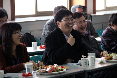 作为此次所庆庆祝活动的重要组成部分——“2012材料物理前沿问题学术研讨会” 计算材料物理分会,于3月17日下午14:00在固体所大楼报告厅准时举行。曾雉副所长和邹良剑主任先后致欢迎辞,对各位室友的归来和到场的嘉宾表示热烈的欢迎!报告会上,复旦大学的吴骅、宁波大学的韦世豪、东京工业大学的王贤龙和中科院物理所的卢峰等室友代表分别就他们最新的科研成果作了精彩的报告。下半场,现在二室的职工代表郝华、李永钢和刘大勇三位博士就二室近年来关注的分子器件中电子输运、面向等离子体材料辐照效应的多尺度模拟,以及多轨道体系中的磁性、超导电性和金属-绝缘体转变等研究成果做了报告。报告间隙,朱大梅老师向所有参会嘉宾赠送了 “中国科学院固体物理研究所30周年所庆物质计算科学研究室论文集选编” 论文集。此论文集由曾雉老师提议,邹良剑主任以及郝华和贾婷两位博士负责整理筛选,并由二室创始人郑庆祺老师亲自把关,收录了三十年来我室较有影响力的代表性文章以及近五年来二室在新的研究领域所做出的贡献。报告会氛围非常活跃,讨论非常热烈。茶歇时,大家在报告厅外仍然侃侃而谈,滔滔不绝,桌子上除了水果点心外,更有二室室友带回来的各种特色地方小吃,让大家在享受学术大餐的同时,又一饱口福。