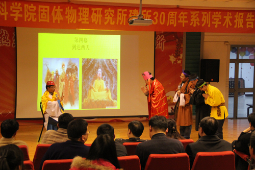 3月18日晚上, “庆所庆,喜相逢”联欢晚会拉开帷幕,众多所友和嘉宾欢聚一堂。20:00,舞台灯光突然暗了下来,音乐想起,开场舞《快乐你懂的》闪亮登场!所友们眼前一亮,顿时被几位师弟师妹青春动感的舞蹈跳的心襟荡漾!热烈的掌声中,曾雉副所长代表二室致辞,对到场的嘉宾和表示热烈欢迎!她总结了二室学生在科研工作方面做出的努力,表示这次也借所庆这个机会向各位所友汇报二室在文艺方面的才能和成绩。首先出场的节目是曾老师领衔的音乐剧《流金岁月》,不同时代的人,不同时代的歌曲,不同年代的风貌,曾老师、郑小宏、宁荣辉、还有可爱的邹意菲小朋友,把过去、现在和未来演绎的淋漓尽致。曾老师的精彩表演,让回所的所友坐不住了,他们跃跃欲试,主动向主持人报上节目,李健老师的《爸爸的草鞋》、李小毛老师的《天路》、吴骅老师的《爱在深秋》、舒大军老师的《传奇》、许英师姐的《历史的天空》、雷勇师兄的《闪亮的瞬间》、李家明老师的京剧《穷人的孩子早当家》、以及和夫人共同演绎的黄梅戏《夫妻双双把家还》等,一次又次刷新大家的视听感受!96级的男生小合唱《朋友》《真心英雄》更把大家带回到他们读书的年代,歌声中,不管你毕业多久,离开固体所多久,都仿佛一下子回到了在固体所共同奋斗的年代。小品《唐伯虎点秋香》《嘻游记》,相声《我也要穿越》《学问》,演员们自己设计的道具、滑稽的表演、诙谐的语言,逗得大家捧腹大笑。游戏环节所友们更是争先恐后地参加,把现场气氛又一次推向高潮!最后,全体二室人又重新演绎了《二室的快乐时光》,回味二室的学习与生活,当曾老师领唱的《明天会更好》歌声响起,各位所友情不自禁地从座位走上舞台,加入合唱的行列,共同祈愿固体所和二室的明天会更好!