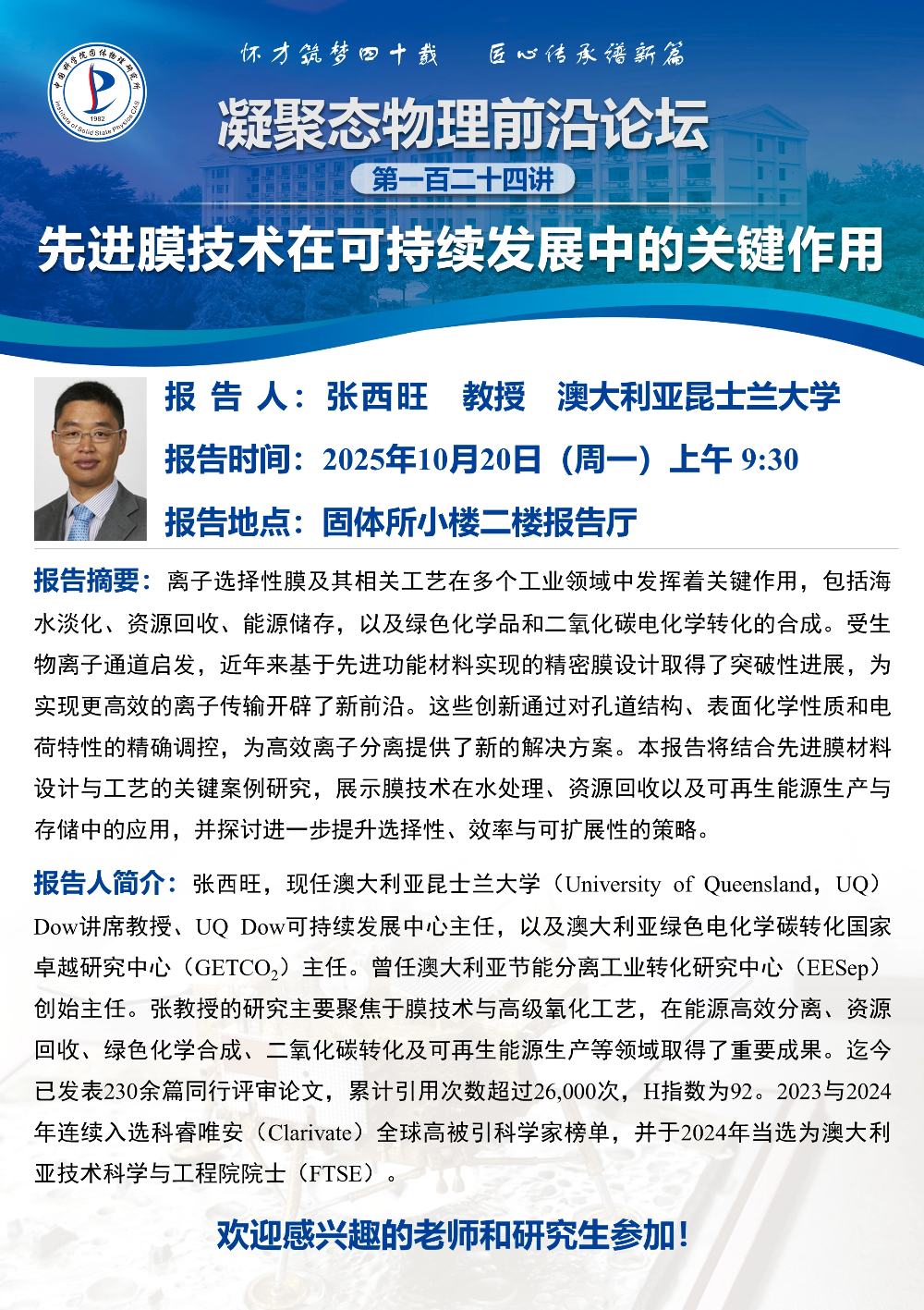 【2025.10.20】先进膜技术在可持续发展中的关键作用(124讲 张西旺 教授 澳大利亚昆士兰大学)