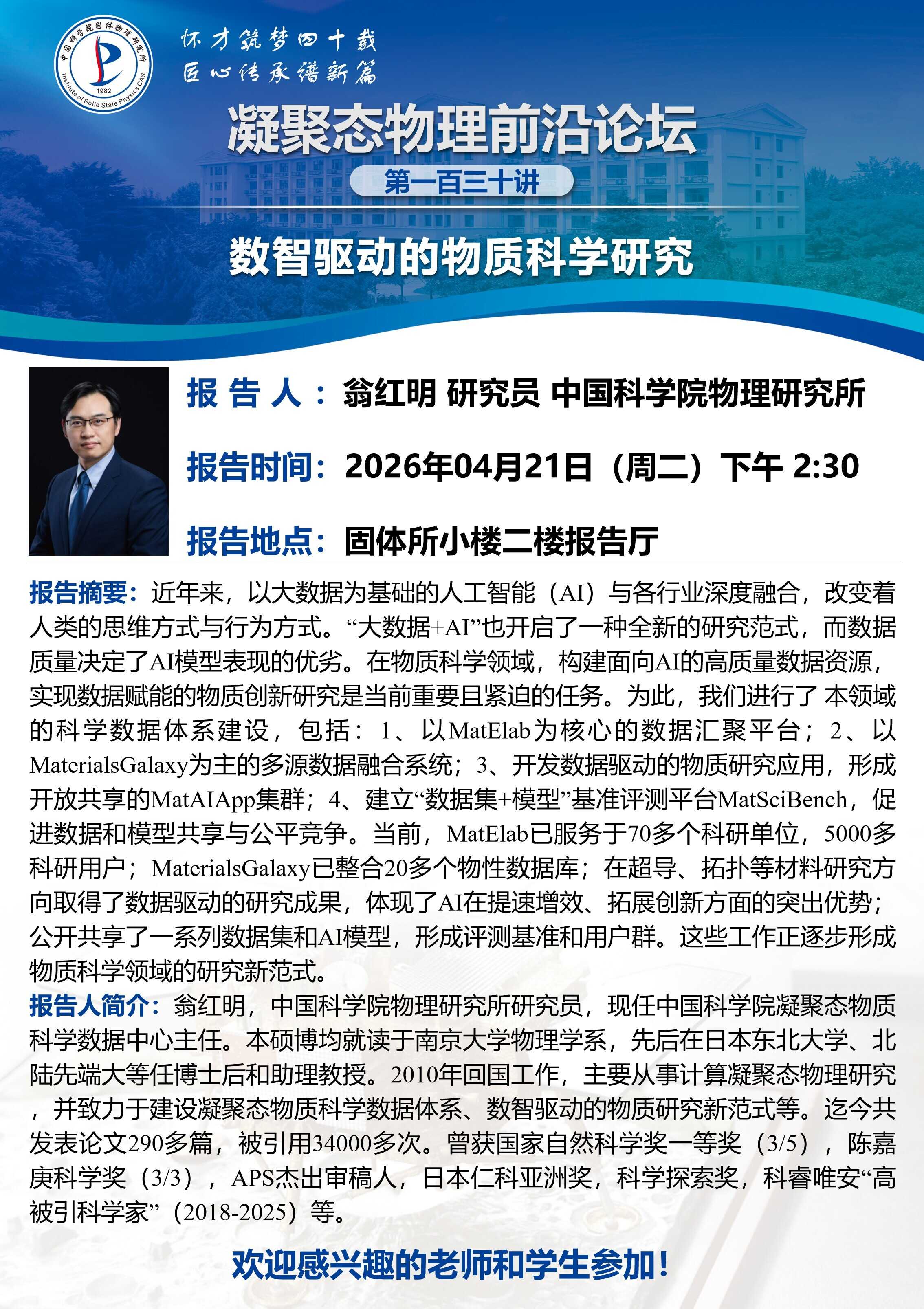 【2026.04.21】数智驱动的物质科学研究(130讲 翁红明 研究员 中国科学院物理研究所)
