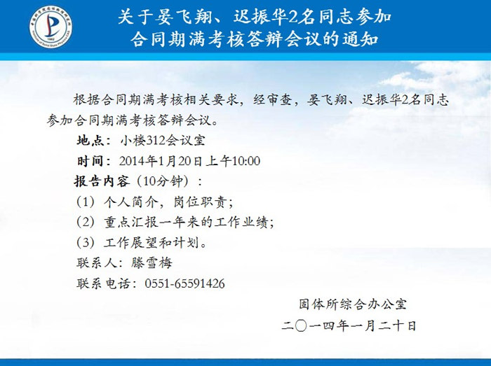 【考核答辩】关于晏飞翔、迟振华同志参加合同期满考核答辩会议的通知