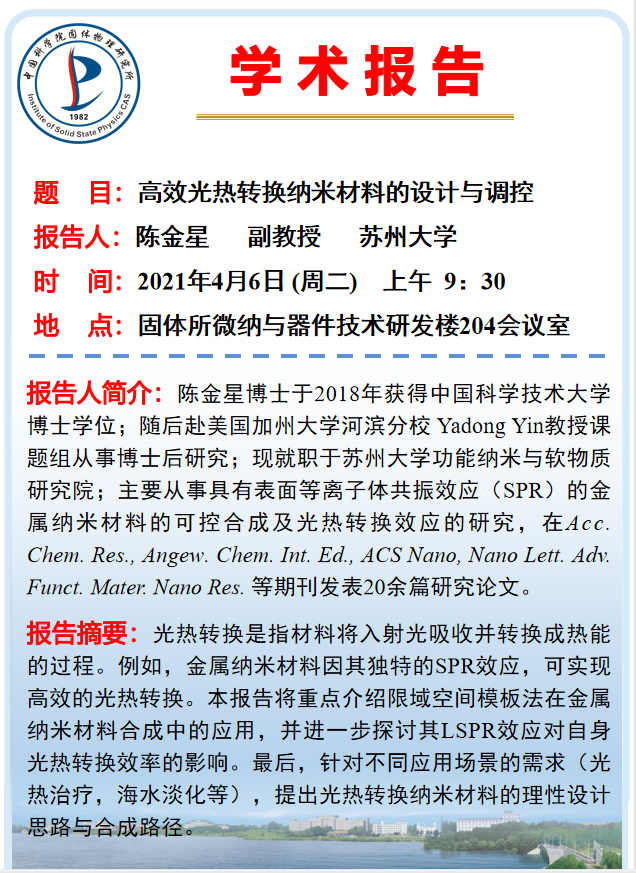 【2021.4.6】高效光热转换纳米材料的设计与调控(陈金星副教授 苏州大学)