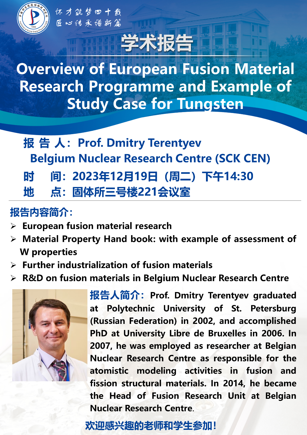 【2023.12.19】Overview of European Fusion Material Research Programme and Example of Study Case for Tungsten(Prof. Dmitry Terentyev Belgium Nuclear Research Centre (SCK CEN))