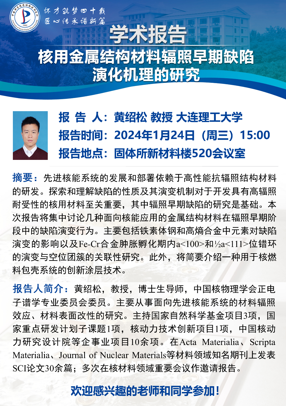 【2024.01.24】核用金属结构材料辐照早期缺陷演化机理的研究(黄绍松 教授 大连理工大学)