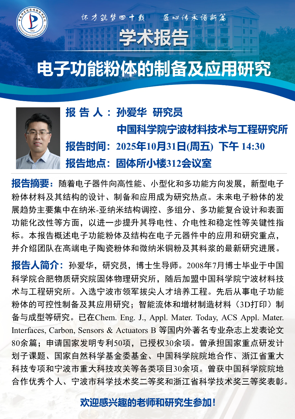 【2025.10.31】电子功能粉体的制备及应用研究(孙爱华 研究员 中国科学院宁波材料技术与工程研究所)