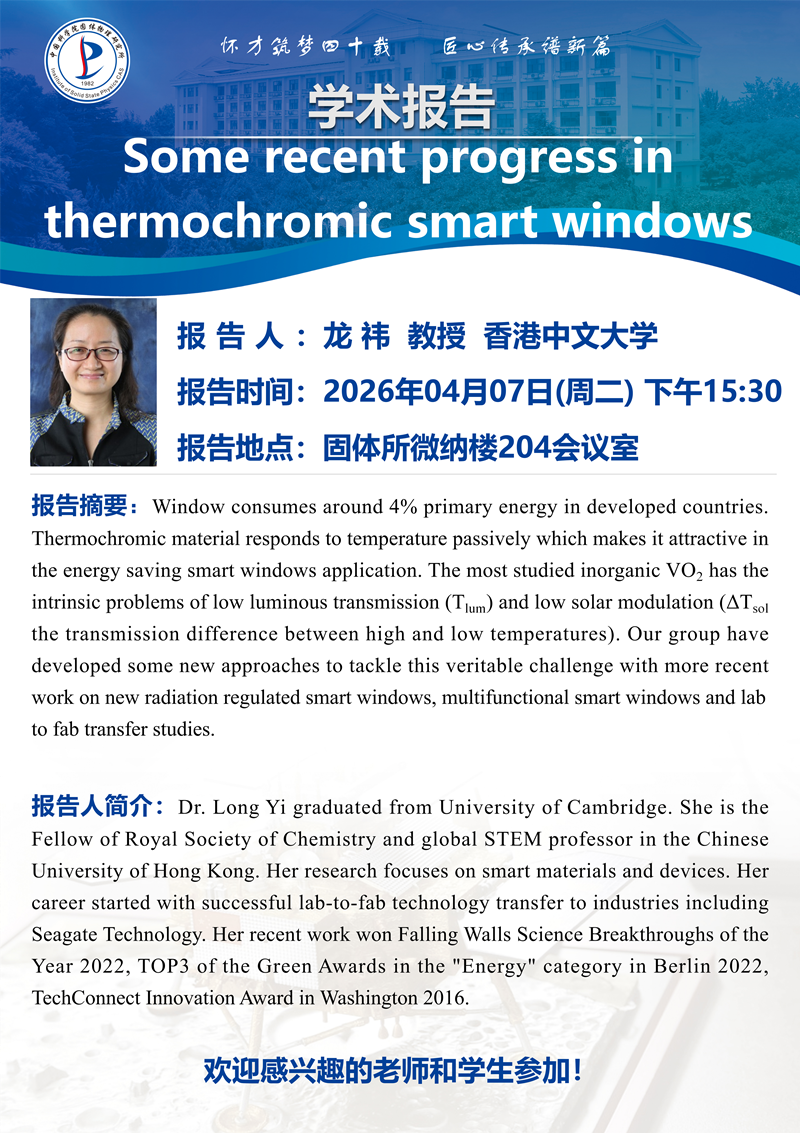 【2026.04.07】Some recent progress in thermochromic smart windows(龙祎 教授 香港中文大学)