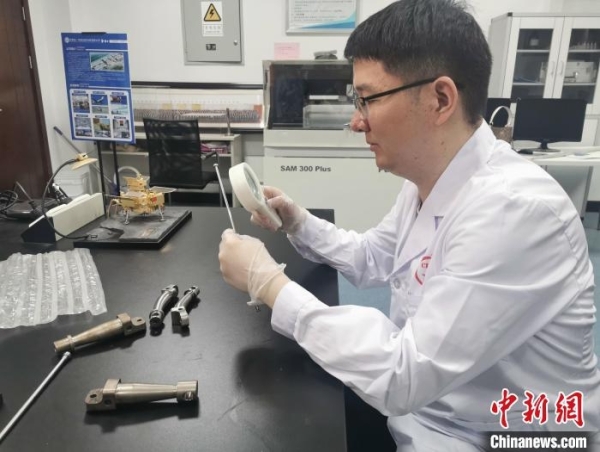 赵莫迪正在观察用“嫦娥钢”制作的缓冲元件。储玮玮 摄