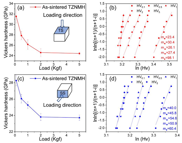 图 3. 高熵硼化物陶瓷在不同载荷条件下的维氏硬度及 Weibull 分布: (a) 、 (b) 顶面; (c) 、 (d) 侧面。