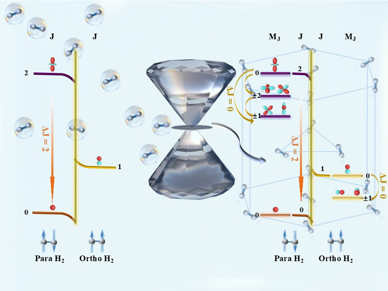 图1. ΔJ=0的产生机理。左半部分是氢分子气态/流体态时转动能级图,右半部分是加压后发生固化的能极分裂示意图。