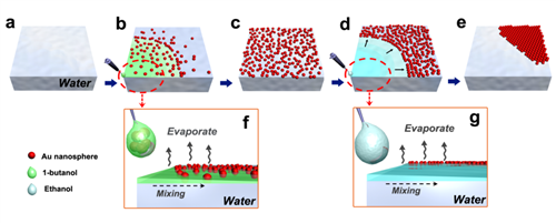 二维大面积金纳米颗粒有序阵列在诸多领域如SERS检测、能源催化和生物传感器等方面有着广阔的应用前景,已成为广大科研工作者的关注焦点。而实现二维大面积有序金纳米阵列的组装,目前常用的方法主要包括LB技术和油/水界面自组装法。其中LB技术是通过调节界面表面张力的大小来实现纳米颗粒在溶液表面进行有序组装,从而获得大面积、且易转移的有序阵列。 然而,该方法需采用特殊传感装置,成本仍较高,且只适用于表面疏水或者具有双亲性的纳米颗粒。而油/水界面自组装法是利用油/水界面处的自由能最低,纳米颗粒可自发地在界面处组装形成有序阵列,但该方法易污染环境和影响操作者的健康,且要求纳米颗粒具有亲水性。因此,发展一种普适的 (适用于任何亲水和疏水纳米颗粒) 自组装方法来获得大面积有序阵列显得尤为重要。