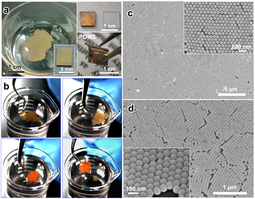 图2. (a) 由双溶剂体系的气/液界面自组装方法获得的金纳米颗粒有序阵列单层膜照片,插图为金纳米颗粒有序阵列转至硅片 (右下方)、石英片和柔性PDMS基底上的照片;(b) 大面积有序阵列单层膜向基底上转移的流程图。(c, d) 自组装金纳米颗粒有序阵列薄膜的SEM正面和斜面图及相应放大图 (插图)。