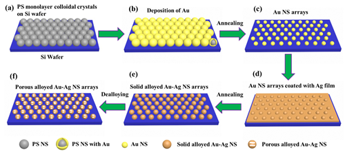 图1. 多孔Au-Ag合金纳米球有序阵列制备过程示意图。