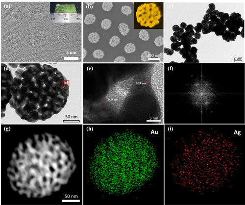 图2. (a)-(b) 分别为多孔Au-Ag合金纳米球有序阵列的FESEM照片((a) 实物图,(b) 单个颗粒);(c)-(f) 多孔Au-Ag合金纳米球的TEM、HRTEM及其傅里叶转换照片;(g)-(i) 多孔Au-Ag合金纳米球HAADF-STEM照片和元素分布图。