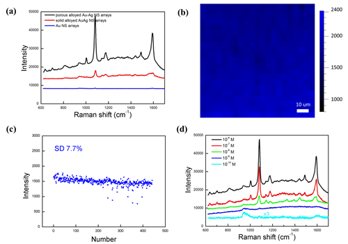 图3. (a)不同结构Au-Ag纳米材料有序阵列对4-ATP 的SERS性能对比结果;(b)多孔Au-Ag合金纳米球有序阵列对4-ATP 的SERS信号强度分布图;(c) SERS信号强度分布标准差;(d) 多孔Au-Ag合金纳米球有序阵列对不同浓度下4-ATP的SERS性能对比图。