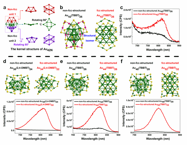 图1. 团簇的结构与荧光性能的关联。a) non-fcc Au42内核结构图; b) 非fcc 和 fcc Au42(TBB)26结构异构对比图; c) 非fcc 与 fcc Au42(TBB)26光致发光对比图; d) 非fcc Au38(2,4-DMBT)24 和 fcc Au34(2,4-DMBT)22的结构与光致发光对比图; e) 非fcc Au44(TBBT)26 和fcc Au44(TBBT)28的结构与光致发光对比图; f) 非fcc Au48(TBBT)28 和 fcc Au52(TBBT)32的结构与光致发光对比图