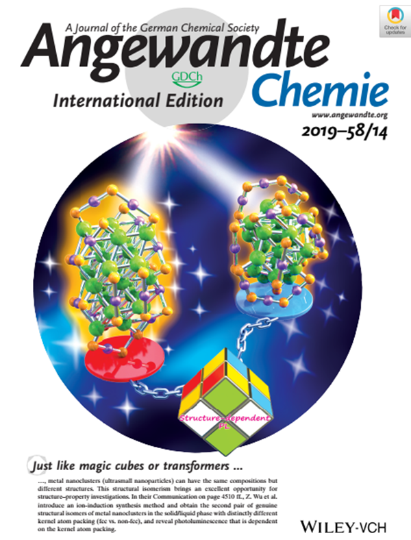 近期,固体所伍志鲲研究员与中国科学技术大学杨金龙教授等合作,在金纳米团簇合成以及结构与荧光性能关联研究方面取得新进展,相关工作以“Fcc versus Non-fcc Structural Isomerism of Gold Nanoparticles with Kernel Atom Packing Dependent Photoluminescence”为题,并作为VIP(very important)和封面论文(见图2)发表在期刊 Angewandte Chemie International Edition(Angew. Chem. Int. Ed. 2019, 58, 4510-4514)上。该工作的共同第一作者为博士后庄胜利和副研究员廖玲文。
