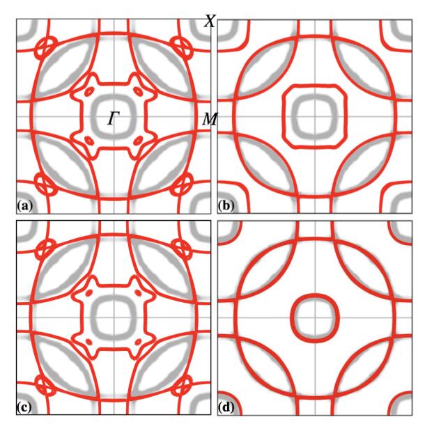 图1. 不同近似下的Sr2RhO4的费米面:(a) LDA;(b) LDA+自旋轨道耦合;(c) LDA+动力学平均场;(d) LDA+自旋轨道耦合+动力学平均场。