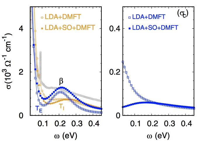 针对这些问题,研究人员采用自己开发的、能够同时精确处理真实晶体结构、晶体场劈裂、自旋-轨道耦合和全部库仑顶角的LDA+SO+DMFT方法,在前期工作 (Phys. Rev. Lett. 116, 106402 (2016); Phys. Rev. B 95, 075145 (2017); Phys. Rev. B 97, 085141(2018); Phys. Status Solidi RRL 1800211 (2018)) 的基础上,详细研究了晶体场、库仑作用及自旋-轨道耦合对Sr2RhO4费米面拓扑结构的影响。基于精确的LDA+SO+DMFT计算结果,他们进而用线性响应理论详细研究了各种因素对光电导的贡献。结果表明,库仑增强的自旋-轨道耦合确实对费米面的有重要影响,但是之前的平均场计算夸大了这种效应。并且与平均场结果不同的是,库仑相互作用对晶体场的增益几乎可以忽略,甚至可能是负值。而对于光电导,只考虑关联作用就可以得到中红外区域的峰,说明自旋-轨道耦合不是其起源。但是自旋-轨道耦合增加了它的强度。有意思的是,对光电导的详细分解表明光电导中主要的成分即不是来自于带间也不是来自于带内的贡献,而是来自于速度矩阵和格林函数矩阵的非对角部分。这种多带效应说明基于单带近似的经验光电导公式并不适用于Sr2RhO4。