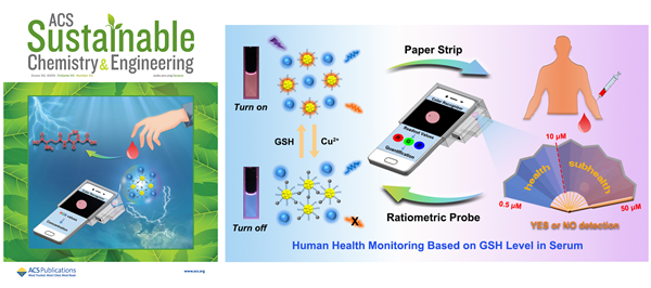 图1. 基于比率荧光试纸的智能手机传感平台对血清中谷胱甘肽水平的监测用于人体健康预判示意图及期刊封面。