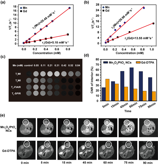 依据纳米造影剂的构-效关系,增加纳米颗粒比表面可有效促进Mn2+离子与水分子的相互作用,有望进一步提高Mn3O4纳米颗粒的增强成像性能。鉴于此,科研人员结合液相激光熔蚀和辐照技术,直接在水相中获得了十分稳定的Mn3O4纳米颗粒;并通过离子交换反应,同时实现构筑多孔型纳米结构和负载氧化铂(PtOx)纳米颗粒,形成多孔Mn3O4/PtOx纳米复合物(如图1所示)。MRI实验结果显示,随着复合材料中Pt/Mn比例的提高,材料的孔隙率及贵金属负载量均逐渐升高,其造影效果也逐渐增强(如图2所示)。该复合体系的纵向弛豫率r1和横向弛豫率r2分别为20.48 mM-1·s-1和29.96 mM-1·s-1,而商用Gd-DTPA的r1与r2值分别为5.18 mM-1·s-1和13.55 mM-1·s-1。多孔Mn3O4/PtOx纳米复合物的r2/r1比值为1.46,远低于高性能T1造影剂的门槛阈值3,也明显低于商用Gd-DTPA的2.61。在小鼠体表肿瘤组织的成像实验中,多孔Mn3O4/PtOx纳米复合物较Gd-DTPA具有更长的体内循环时间,且成像信号强度(CNR)值更高。同时,细胞毒性测试、血液学和组织学分析等一系列生物安全性实验结果证明该材料体系具有较高的生物相容性,进而说明,多孔Mn3O4/PtOx纳米复合物具有安全高效性。