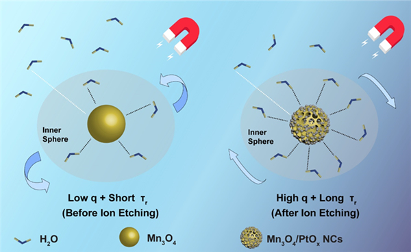 核磁共振成像(MRI)是一种安全高效的体外检测手段,使用造影剂可有效增强成像效果。目前,商用纵向弛豫(T1型)钆基小分子造影剂(如:Gd-DTPA)存在两大弊端:(1) 代谢速度过快;(2) 可能会引起肾源性系统纤维化。随着生物纳米材料体系的不断壮大,开发安全高效的T1型无机纳米造影剂逐渐成为发展趋势。由于二价锰离子(Mn2+)具有十分丰富的未成对电子,因而锰基纳米造影剂受到了广泛关注,四氧化三锰(Mn3O4)纳米材料就是其中的一类典型代表。然而,为满足生物安全性要求,Mn3O4纳米颗粒必须具有与生物体内环境相兼容的表面修饰成分,且水合粒径较小,这导致材料表面Mn2+离子很难直接与水分子在磁场下发生能量交换,使得其增强成像性能不佳。