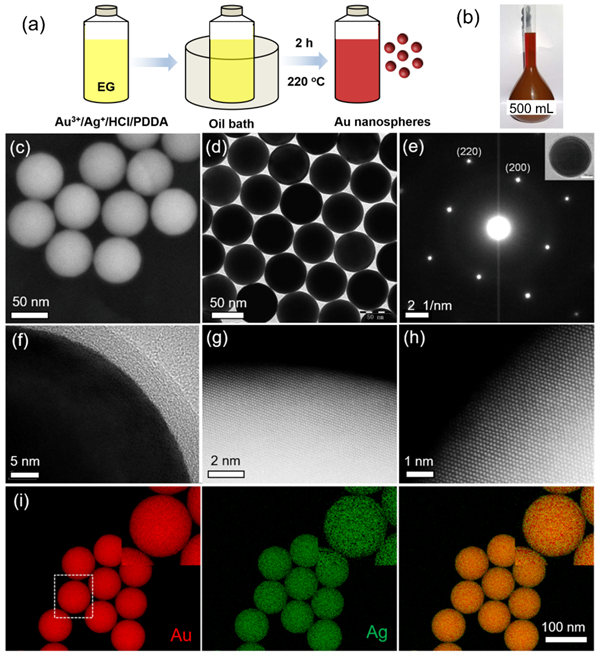 在该工作中,研究人员基于多元醇还原法发展了一种简单高效的一步法批量制备具有超光滑表面的但分散单晶Au NSs策略。该方法只需将适量氯金酸、表面活性剂PDDA、盐酸以及痕量的硝酸银加入乙二醇溶液中,并在220 oC油浴中反应两小时即可(图1a)。所获的Au NSs尺寸均一,产率接近100%,远远优于传统的种子生长法。即使是在原子级分辨率的球差校正图像中观察,也没有发现明显的小平面,充分证明了该方法获得Au NSs具有几乎完美的球形结构。