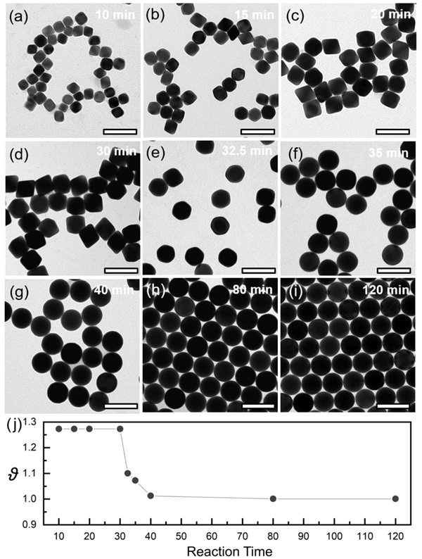 图2展示了单晶Au NSs演变过程的TEM照片。实验表明,在PDDA的保护作用下,Au纳米球在反应初期是以八面体的形貌进行成核生长;随着反应进行到30 min, Au源基本耗尽,八面体尺寸达到最大值;随后,Au八面体平面在5min之内迅速转变为圆滑表面,并在120 min时完全转变为尺寸均一、表面光滑的球形结构。 统计分析结果显示,Au NSs的形貌因子为1.0008±0.0001,是一种几近完美球形结构。