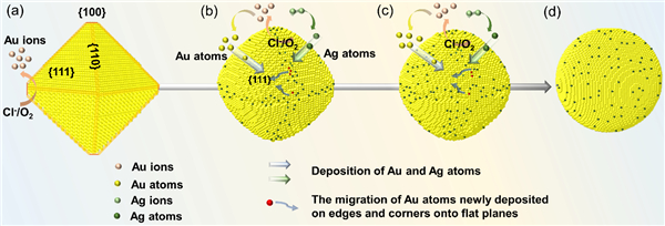 经过结构、元素等一系列参数的分析,研究人员提出了一种崭新的Au NSs 形成机制:O2/Cl−刻蚀对诱导的表面自抛光和Ag离子动态调控的再生长(图3)。在30 min之前,Au纳米颗粒受到PDDA的选择性吸附,形成具有{111}晶面包覆的八面体结构;当Au源消耗殆尽,O2/Cl−刻蚀对不断氧化刻蚀边角等高能量位点,暴露出大量Au{100}和{110}晶面;随后,痕量的Ag离子不断从AgCl中释放出来,选择性吸附在Au {100}和{110}晶面上,使得刻蚀得到的Au离子还原后优先沉积在{111}晶面;经过 O2/Cl−刻蚀对不断氧化刻蚀高能位置以及Ag离子的动态调控Au原子的再生长方向,逐步形成具有超光滑表面的Au NSs。