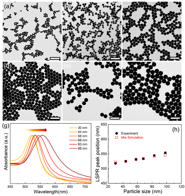 Au NSs的尺寸及LSPR性能可基于上述机理,调节反应参数,在30-100 nm范围内获得单分散的Au NSs。由于Au NS的完美球形形貌,其LSPR光吸收性能与米氏散射理论模拟结果高度吻合。此外,该方法可以单次制备500ml Au NSs胶体溶液,且具超高的稳定性(乙二醇中保存时间大于两年),这为以Au NSs为单体的等离子体超材料提供了理想的实验模型。