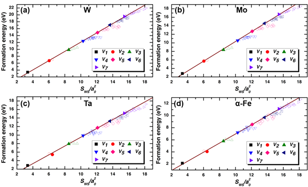 图1. V1-V7 纳米孔洞在 W (a), Mo (b), Ta (c),以及 α-Fe (d)中的形成能随Wigner-Seitz表面积SWS的变化。 其中a0 为相应的晶格常数。实心数据点代表最稳定的结构,空心点为亚稳定结构。