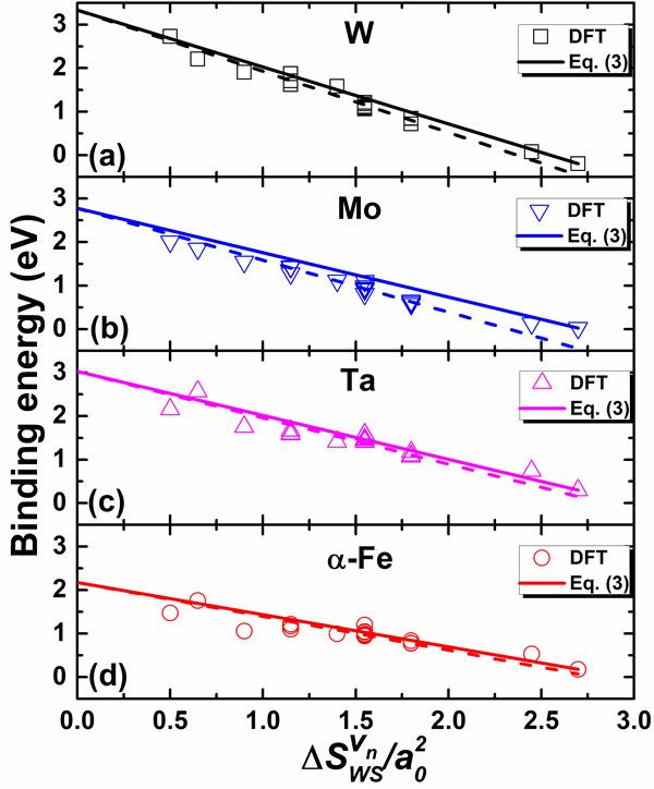 图2. V2-V20 纳米孔洞在 W (a), Mo (b), Ta (c) ,以及 α-Fe (d)中的空位结合能与Wigner-Seitz表面积变化∆SWSVn之间的关系。 其中a0 为相应的晶格常数。数据点代表DFT计算结果,直线为模型预测结果。