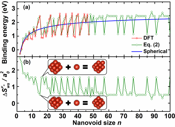 图3. W中纳米孔洞的空位结合能(a)以及Wigner-Seitz表面积变化∆SWSVn (b)随纳米孔洞尺寸n的变化。 其中a0 为相应的晶格常数,n为纳米孔洞中包含的空位个数。图中给出了DFT计算值(红色数据点)、模型预测值(绿色数据点)、以及传统球形近似模型预测值(蓝色实线)的比较。