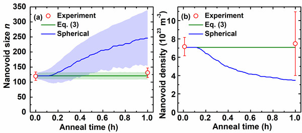 图4. 1373K下纳米孔洞平均尺寸(a)以及密度(b)随退火时间的变化的OKMC模拟。红点为文献中给出的实验数据,蓝线为基于传统球形近似的模拟结果,绿线为基于新预测模型的模拟结果,阴影区域代表相应数据的标准差。