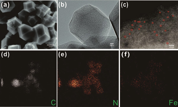 图1. Fe-ISAs@CN的(a) SEM、(b)TEM、(c)HAADF-SEM、(d-f)Mapping图。
