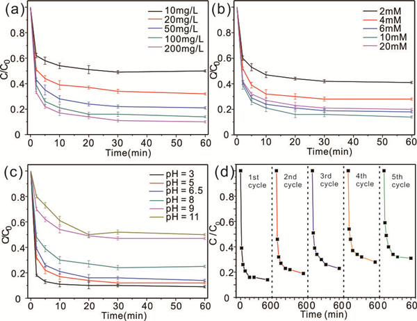 图2.不同反应条件下磺胺嘧啶的降解效果曲线: (a) Fe-ISAs@CN投加量对降解效果的影响,(b)H2O2投加量对讲解效果的影响,(c)初始pH对降解效果的影响,(d)循环使用效果曲线。
