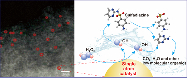 鉴于此,研究人员以合成的Fe(acac)3@ZIF8为前驱体,制备出一种十二面体高活性单原子铁类芬顿催化剂Fe-ISAs@CN,其表面及中空结构暴露出大量的催化活性位点。通过对磺胺嘧啶的降解实验发现,在60分钟内,0.1 g/L剂量的Fe-ISAs@CN可去除91%的10 mg/L磺胺嘧啶。机理分析表明,Fe-ISAs@CN催化剂表面暴露的高活性位点,能够快速活化H2O2产生大量的羟基自由基·OH,实现磺胺嘧啶的高效降解。经过五次循环后对磺胺嘧啶的去除率仍大于80%,且催化剂中铁元素流失量小,具有较好的稳定性。本研究为抗生素等难降解污染物的高效去除提供了新思路。硕士研究生杨武为论文第一作者,张开胜副研究员等为通讯作者。