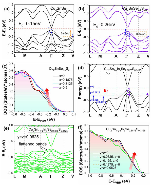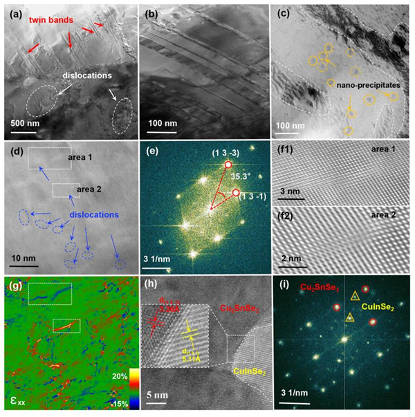 针对Cu2SnSe3具有价带多能谷的特点,研究人员采取元素替代/空位对其能带结构进行综合调控来提升其PF。研究表明,Se位固溶硫可以有效的增宽带隙和提高价带顶的态密度(如图1),使得Cu2SnSe3高温热电势从170提高至277 µVK-1;而Sn位掺In会造成多轻带/能谷参与输运,显著提高了能带简并度和态密度(如图1),进而大幅提高该化合物的电导率和热电势,使得Cu2SnSe3的功率因子提升了2.5倍(在800K时PF=9.3µWcm-1K-2)。与此同时,研究发现在Sn位重掺In可以诱导形成多维缺陷(如Sn空位、位错、相界/孪晶界和CuInSe2纳米析出相,如图2),实现对声子的全频谱散射从而大幅降低晶格热导率 (如图3(b))。最终,Cu2SnSe3的最高ZT值在858 K时可达到1.51,是目前本体系报道的最高值 (如图4)。相关工作为Cu2SnSe3基材料的热电性能调控提供了新思路。