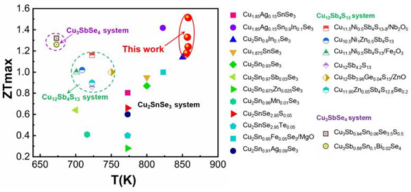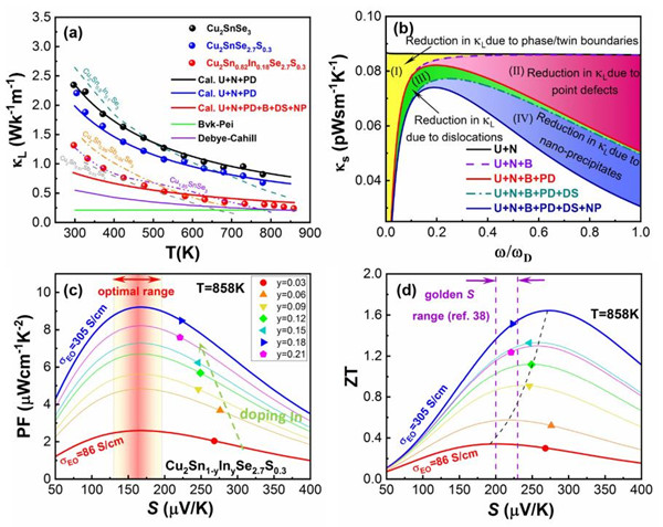热电技术作为有望解决能源问题的新途径,近年来引起广泛关注。热电材料的转化效率由无量纲量ZT表示,ZT=S2T/ρ(κc+κL), 其中S为热电势,T为绝对温度,ρ为电阻率, κc和κL 为载流子和晶格对热导率的贡献。Cu2SnSe3 是一种组成元素廉价、环境友好的新型热电材料,但其较高的电阻率和较低的热电势导致功率因子PF (PF=S2/ρ)和ZT值(~0.2)较低。目前对于Cu2SnSe3热电性能的优化主要是通过Sn位掺杂提高空穴浓度,然而这种掺杂会导致热电势的大幅下降和电子热导率的显著提升, 使得ZT值的提升有限。此外,大多数研究只通过引入一到两种缺陷来降低材料的晶格热导率,很少利用多维缺陷(0维到3维)的引入实现对声子的全频谱散射,进一步降低晶格热导率。