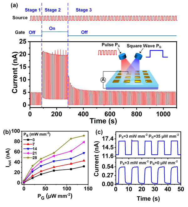 图1. (a)紫外光(Gate光)调制下晶体管输出的由红外光(Source光)产生的热电子光电流的I-t曲线(插图为晶体管的工作示意图);(b)不同功率密度的紫外光(PG)和红外光(PS)照射到晶体管上后输出的电流;(c)在有紫外光和没有紫外光作用下,红外光照射下的I-t响应曲线。