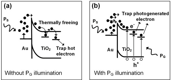 图2. (a)只有红外光照射时,热电子越过势垒的示意图;(b)紫外光照射下热电子越过势垒的示意图。