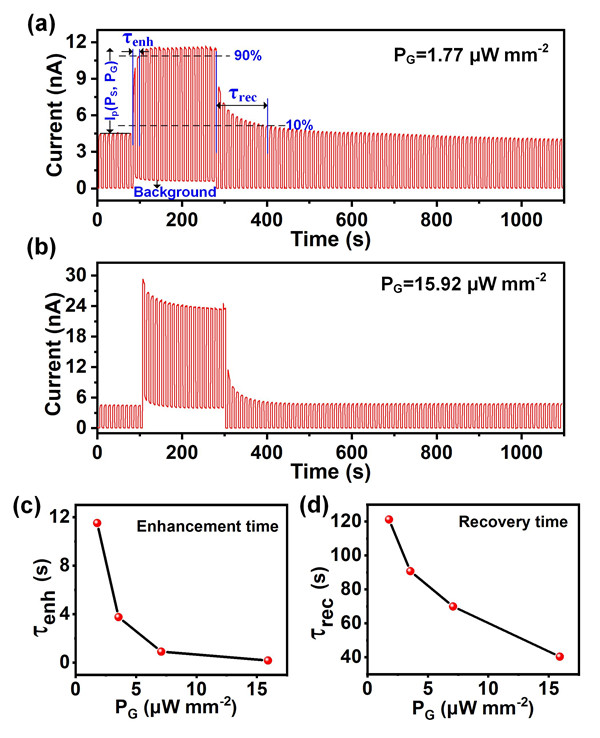 图3. 紫外光对红外光产生的热电子光电流增强和恢复稳定过程的影响。(a,b)在不同功率密度的紫外光作用下,热电子光电流的I-t曲线;(c)热电子光电流稳定的增强时间τenh和(d)恢复时间τrec随着紫外光功率密度的变化趋势。