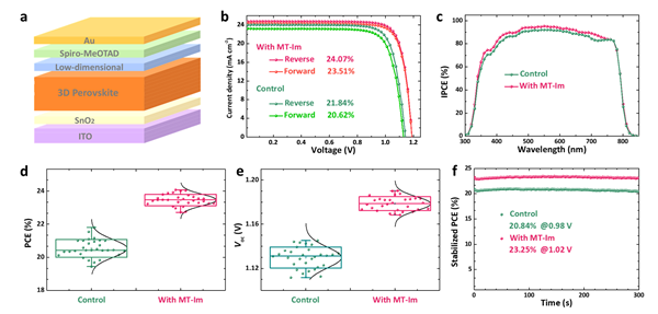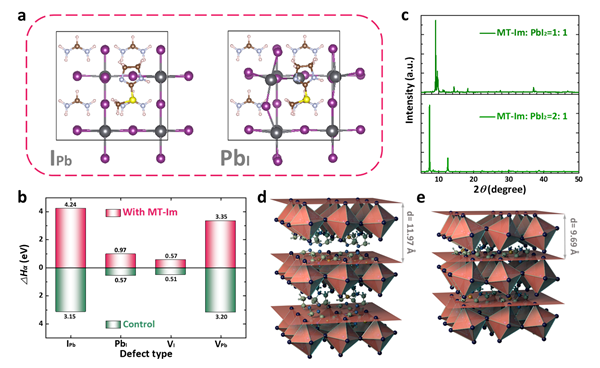 研究团队通过引入2-甲硫基-2-咪唑啉(MT-Im)阳离子,设计新型低维钙钛矿材料并引入钙钛矿吸光层和空穴传输层界面。由于MT-Im阳离子既可以作为电子受体,又可以作为电子给体,能够对界面多元性的铅(Pb)基缺陷进行定向管理。其中-C=N和-S-CH3基团表现出路易斯酸性,与未配位的Pb2+形成Pb-N和Pb-S配位键,抑制Pb0的产生;NH2+基团又可以与PbI3-(Pb-I反位缺陷)形成配位键,锚定Pb2+离子。通过密度泛函理论(DFT)计算可知(图1a,b),含有MT-Im的钙钛矿界面处PbI和IPb缺陷形成能分别由0.57 eV和3.15 eV升高至0.97 eV和4.24 eV,可以有效抑制缺陷的产生。同时,研究发现,当调节MT-Im阳离子的浓度时,界面处低维钙钛矿呈现出混合晶相(图1c-e),有利于提高对于不同类型界面缺陷的钝化效果,实现稳定钙钛矿界面的作用。