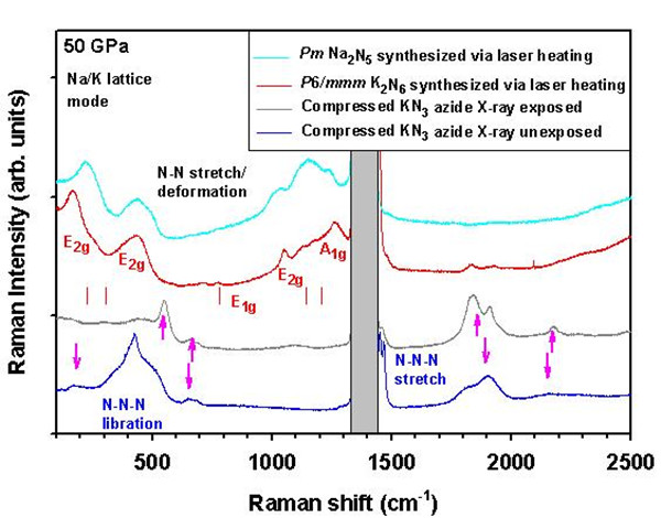 金属元素能够向氮氮键掺杂电子并促进其解离,实验上通过掺杂金属元素,可以降低合成压力并提高聚合氮化合物的稳定性,并且不同的金属元素具有不同的核外电子数目及排布,与氮元素形成化合物时可以具有丰富的结构和组分变化。理论预测的稳定结构基团包括N5-氮五环阴离子、N62-氮六环二价阴离子和链状、网状聚合氮等,其中一些含有氮五环阴离子盐能够以亚稳态形式保存至环境条件。然而目前高压实验下合成的LiN5 、CsN5,以及利用 NaN3分别合成的两种五唑盐(Na2N5 和NaN5)和两种二氮结构(Na3(N2)4 和 NaN2)的化合物等,还不能保存至常压。研究结果发现,使用含有线性 N3-基团的叠氮化物作为前驱体可以显着降低反应的活化势垒(与分子 N2 相比),通过化学反应或者结构相变合成多种聚合氮化物。