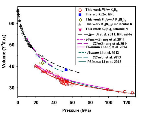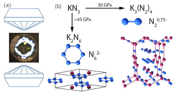 王宇博士花费5年时间,通过反复探索实验合成条件,综合分析了大量的实验数据,最终发现利用 KN3 作为初始反应物,在高温高压条件下可以将含有线性 N3-基团的叠氮化物转变为具有金属性质的、含有氮六环二价阴离子基团(N62-)的新型氮化物K2N6 。这是在实验上首次发现此类含有平面氮六环二价阴离子基团的氮化物,且该氮化物可以在低温下保存至20 GPa。