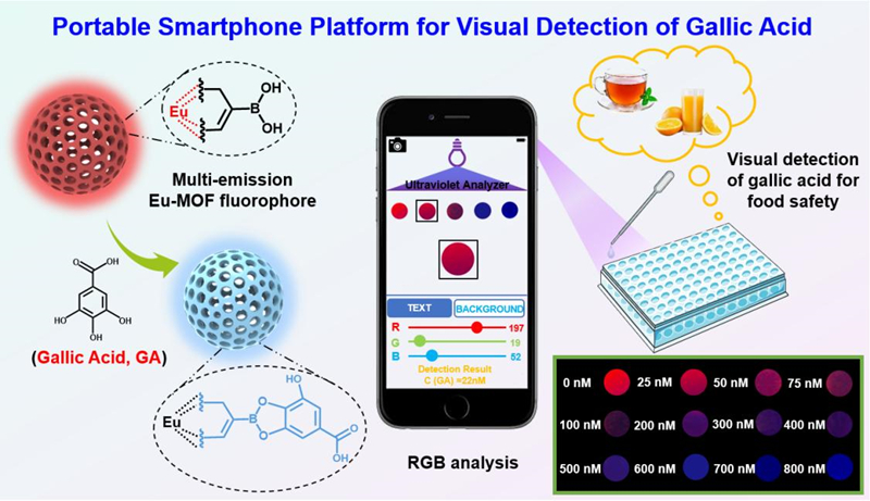 研究人员基于硼酸配体和铕金属离子的聚合,开发了单波长激发下的多发射Eu-MOF,用于快速可视化检测没食子酸,并且利用智能手机APP(颜色识别器)识别荧光探针溶液颜色的RGB值完成了对没食子酸的可视化检测。引入硼酸基团后,Eu-MOF在单波长激发下有两个发射中心,在检测没食子酸时,Eu-MOF的发射颜色在紫外灯照射下可由红色变为蓝色,即由Eu-MOF中能量转移效率的转变引起。这种多发射Eu-MOF具有显著的发光性能、高灵敏度和对没食子酸的快速视觉响应,并对没食子酸的检测具有良好的分散性和较低的检测限,可用于茶和果汁等实际样品中没食子酸的检测。结合智能手机制备的荧光传感平台,可进行现场、快速、半定量、可视化的检测。所设计的方法为食品质量控制评价体系的开发提供新的思路与途径,并有望扩展多发射Eu-MOF在化学和分析传感领域的应用。