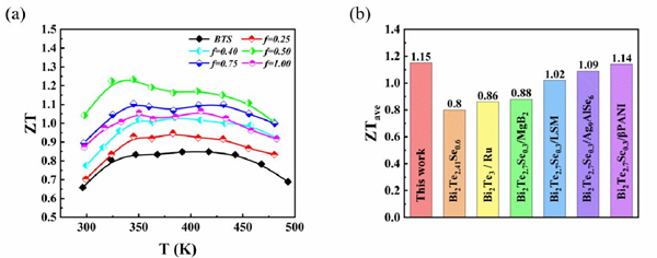 此外,研究人员通过复合体系设计与性能调控,向BTS基体复合介观尺度导电聚合物聚苯胺(PANI)纳米粒子,构建介观尺度的载流子输运调控和声子散射(阻隔)基元,研究和探讨超低热导率导电聚合物基元对BTS基复合体系晶格热导率、热电势及PF等的影响。研究发现,复合体系的晶格热导率在300 K时降低了49%,这主要是由于聚合物包裹体增强了声子散射。此外,无机/有机边界处形成的界面势产生了能量过滤效应,导致复合体系的热功率提高8%。1.5wt%BTS基复合样品的最大ZTmax 达到1.22 (345 K) (Chem . Eng. J, 455, 140923(2023))。