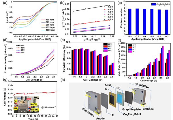 基于此,固体所研究人员采用简单的气相水热合成法,在碳纸上原位生长了异质双金属磷化物催化剂(Cu3P-Ni2P/CP-x,x代表Cu3P和Ni2P的摩尔比),并在H-型电解池中初步评测了Cu3P-Ni2P/CP-x催化剂的电催化NO3-性能。Cu3P和Ni2P的摩尔比为0.5(Cu3P-Ni2P/CP-0.5)的催化剂具有优异的NO3RR性能,在-0.6 V(vs. RHE)电位下、0.5 M Na2SO4溶液中,氨产率及法拉第效率(FENH3)分别为3.21±0.44 mg h-1 cm-2、95.25±2.83%。基于旋转圆盘电极(RDE)进一步测试催化剂的NO3RR动力学,结果表明Cu3P-Ni2P-0.5样品具有最快的反应动力学,并且所有样品转移电子数(n)与电位之间的规律与H-型电解池中的FENH3相似。