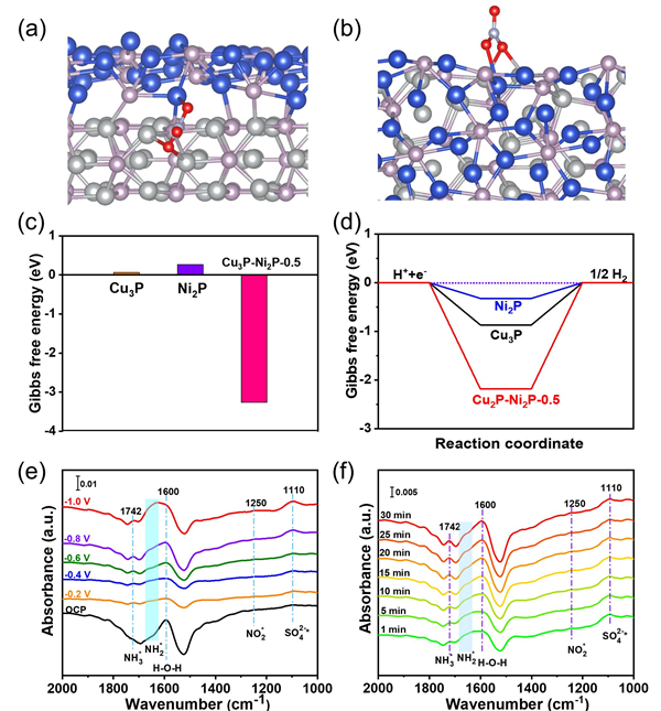 为了降低H-型电解池中的传质损失,研究人员进一步利用膜电极(MEA)电解槽研究了Cu3P-Ni2P/CP-0.5在工业级电流密度下的电催化NO3-还原性能。反应温度为55℃、槽电压为2.6 V时,电流密度可达764 mA cm-2。测试不同电压下氨的法拉第效率和产率发现,当槽电压为2.6 V时电解槽展现出最优的NO3RR性能,氨产率为1.9 mmol h-1 cm-2。在稳定性测试中槽电压并没有明显的衰减,展现出在工业级电流密度下的耐久性。理论计算和原位红外光谱结果显示Cu3P-Ni2P/CP-0.5催化剂中的异质界面有利于促进NO3-吸附与活化,NO3-可能通过连续加氢脱氧路径转化为NH3。该工作有望推动膜电极电解槽在NO3-废水处理以及氮循环方面的研究。
